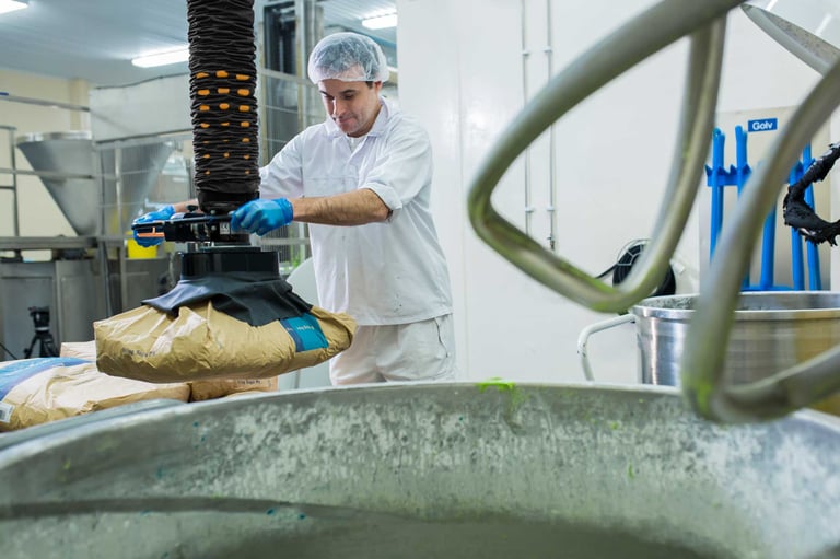 By using a smart lifting solution, like a vacuum lifter, the company can both increase worker health & safety and improve productivity. The bags can be lifted faster and without physical strain using the right lifting equipment. Ensuring an even flow of bags into the mixer, every hour of every day.